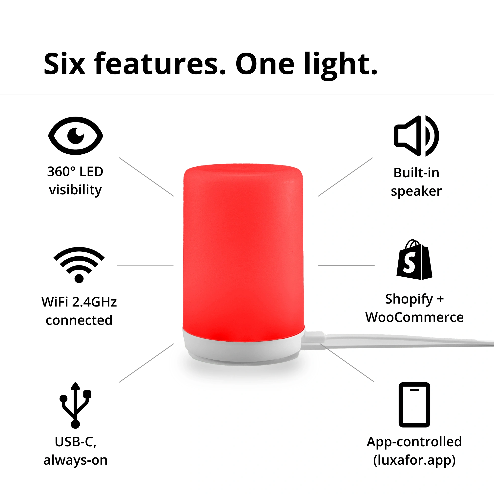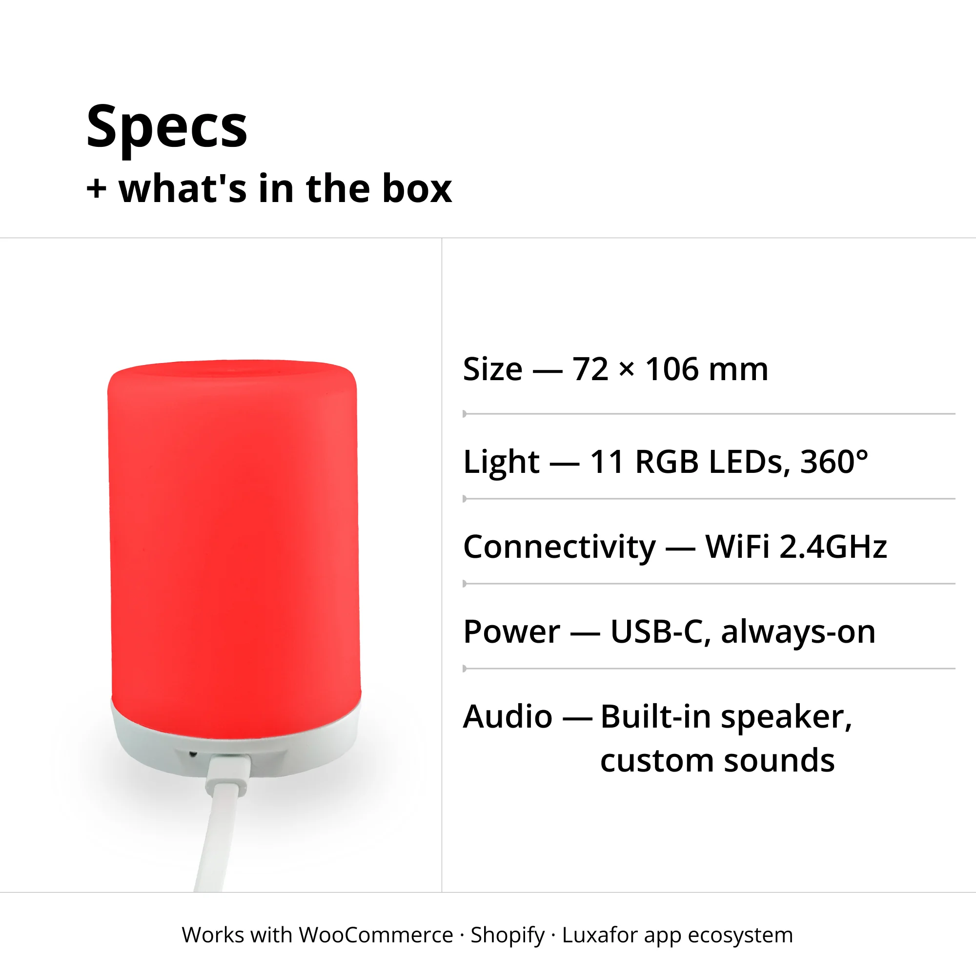 | Integrations | WooCommerce, Shopify + Luxafor app ecosystem (ex. MS Teams) |